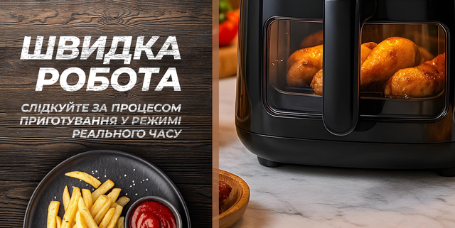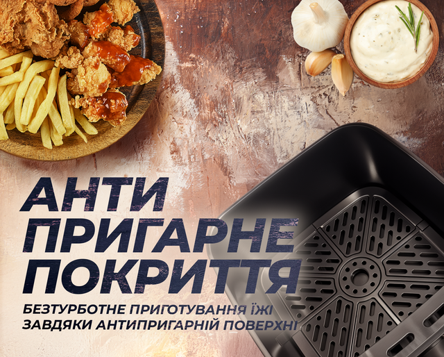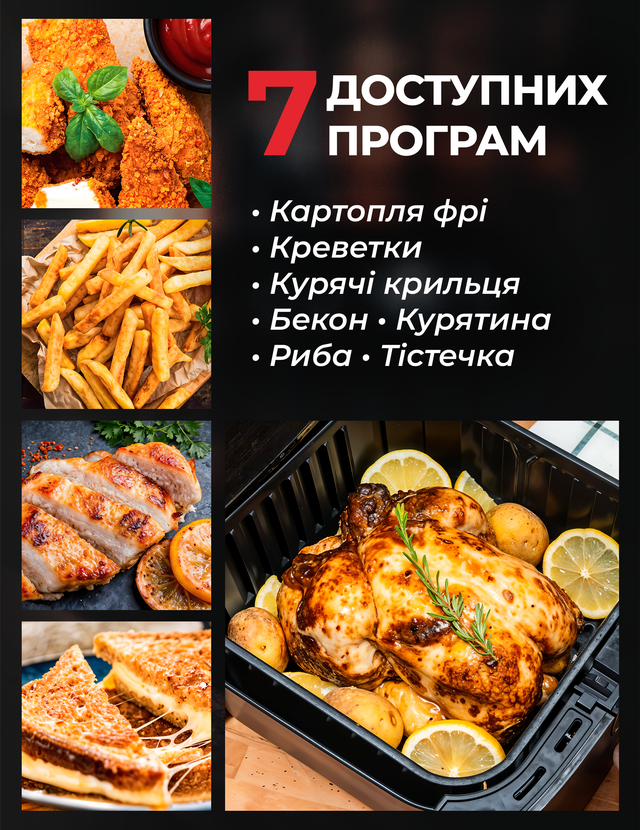 • 7 автоматичних програм. Оберіть оптимальний режим для картоплі фрі, курячих крилець, овочів, риби чи десертів.