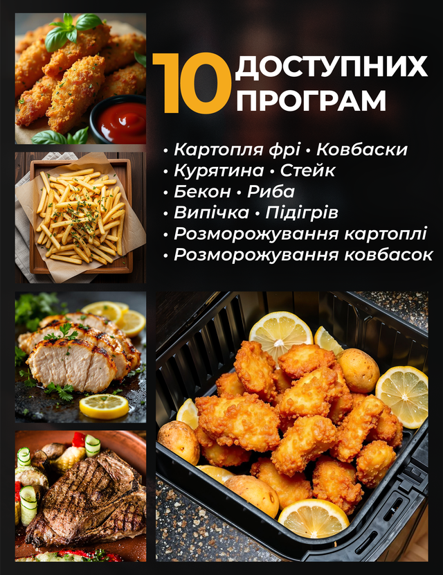 10 автоматичних програм. Для картоплі фрі, м’яса, риби, овочів, випічки тощо.