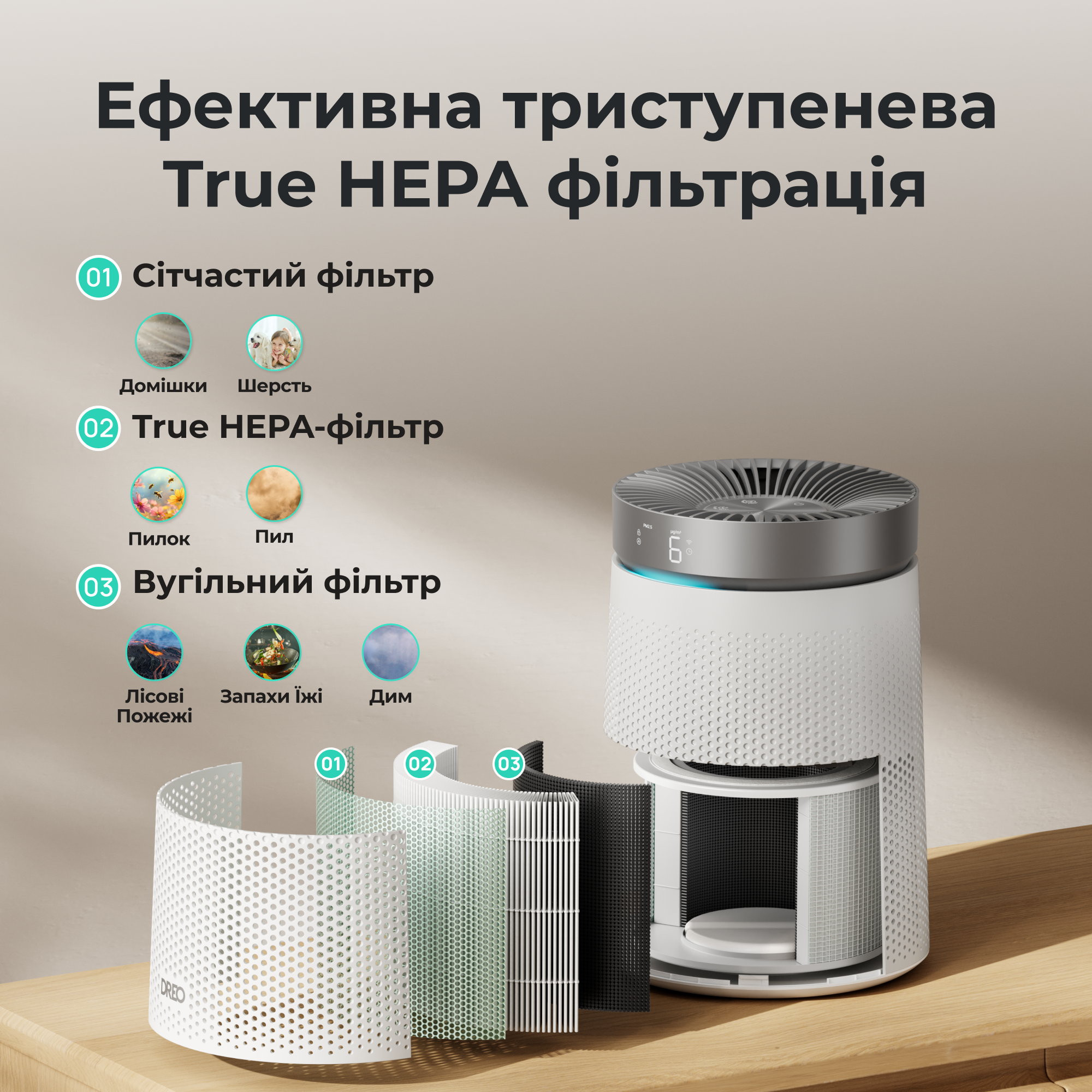 Dreo Macro AP606 поєднує компактні розміри, багаторівневу систему фільтрації та автоматичний контроль, допомагаючи підтримувати стабільну якість повітря у житлових приміщеннях.